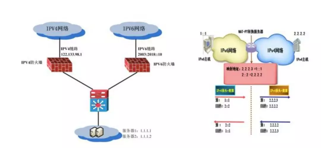 采用 NAT64 技术,通过网络设备协议翻译,达到 IPv6与 IPv4 的网络地址与协议转换,实现了 IPv6 网络与 IPv4 网络的双向互访,企业网站同时支持 IPv4 和 IPv6 的访问,IPv6 的增加不影响原有的 IPv4 用户访问。