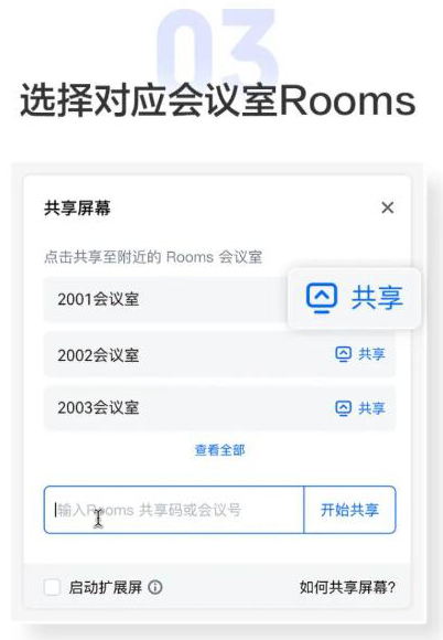很多重要会议基本都是线上线下融合模式,过去在线下会议室开会需要拉对方会议室Rooms入会时往往需要互传一长串会议号,然后在大屏上手动输入后入会,十分繁琐还容易出错。