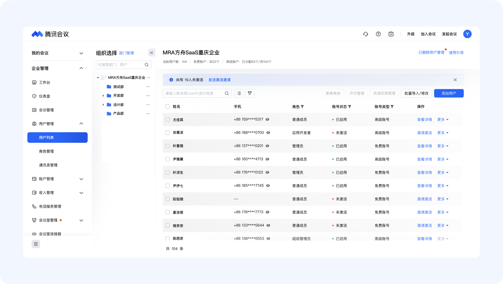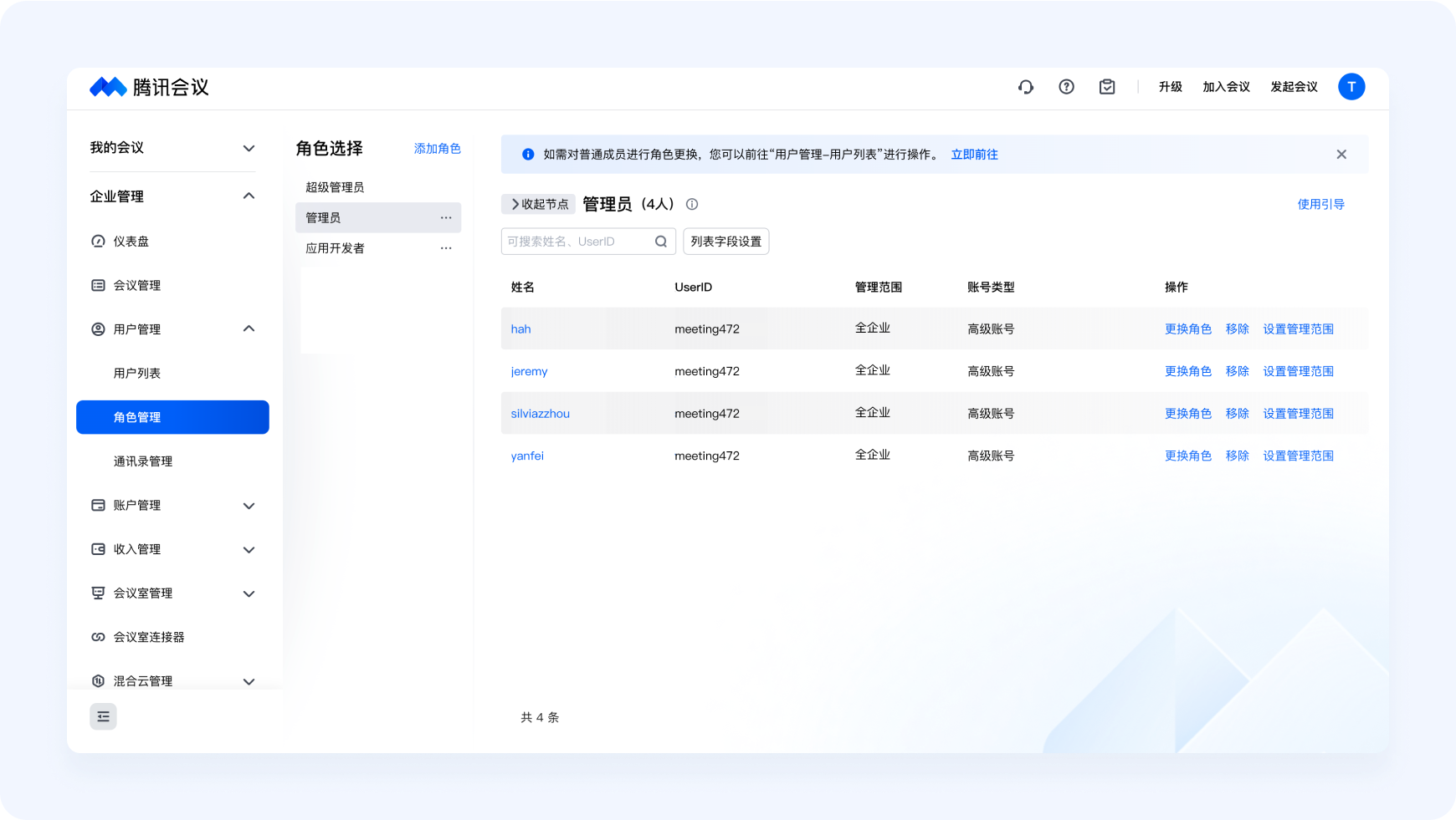 企业管理员能够对已纳入企业组织管理的成员进行角色分配,腾讯会议提供了多种默认角色:超级管理员、管理员、应用开发者、普通成员。