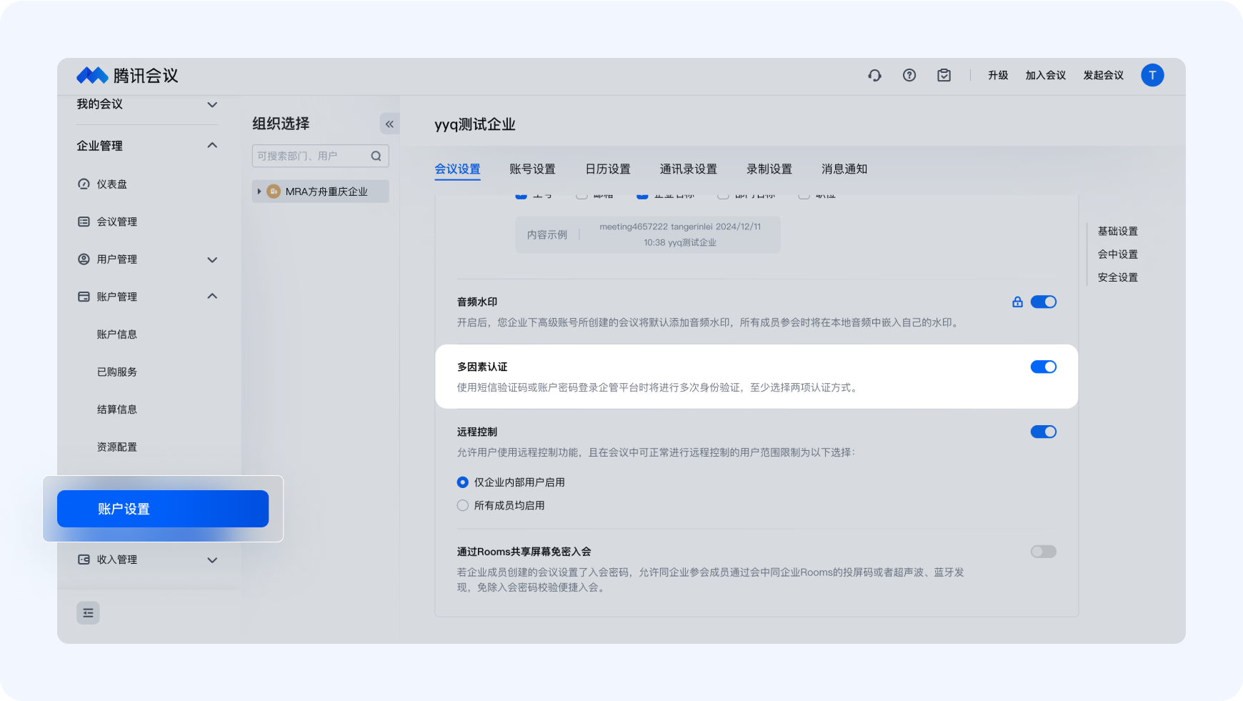 您可以前往企业管理后台-【账户管理】-【账户设置】-【会议设置】中开启【多因素认证】。开启后若企业员工账号在新设备上使用,腾讯会议支持要求进行二次核验,企业员工可通过手机验证码或旧设备授权两种方式进行验证,避免被盗号登录的风险。