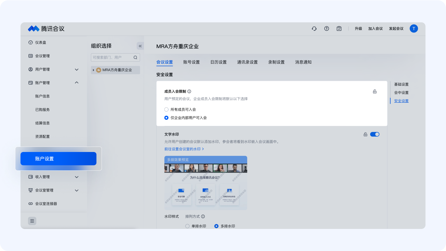作为管理员,您可以前往企管后台-【账户管理】-【账户设置】-【会议设置】中调整您所在组织的默认选择(“所有人员可入会”或“仅企业内部用户可入会”),当组织内成员发起会议时,会默认以该方式发起。
