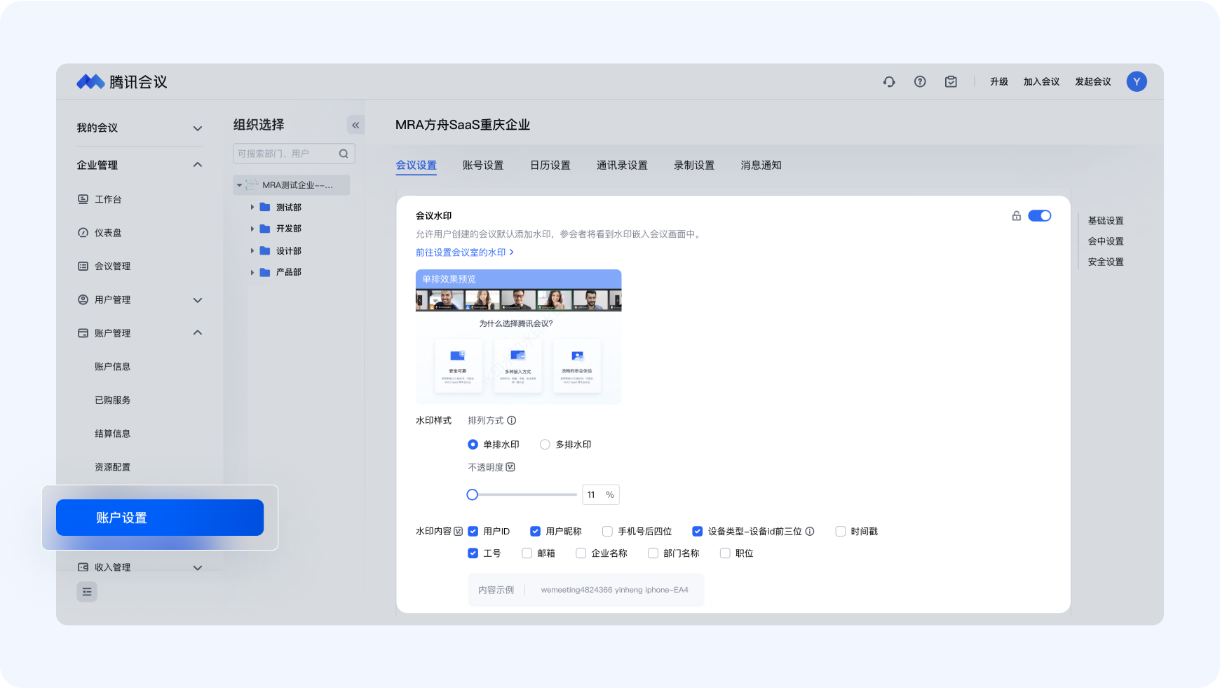 您可以前往企管后台-【账户管理】-【账户设置】-【会议设置】中调整水印的样式、内容,开启多排水印后,组织内用户创建的会议在共享屏幕时将添加水印,参会者将看到水印嵌入会议画面中。