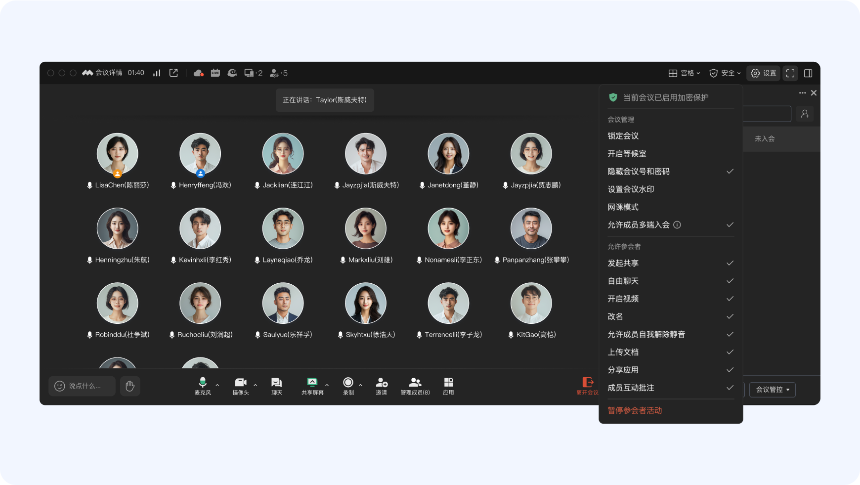 我们为会议主持人提供包括会议密码、等候室、锁定会议、一键全体静音、共享屏幕等安全能力,让主持人能充分把控会议秩序,防止重要内容泄露。如遇紧急情况,还可选择“一键暂停参会者活动”,马上恢复会议秩序。